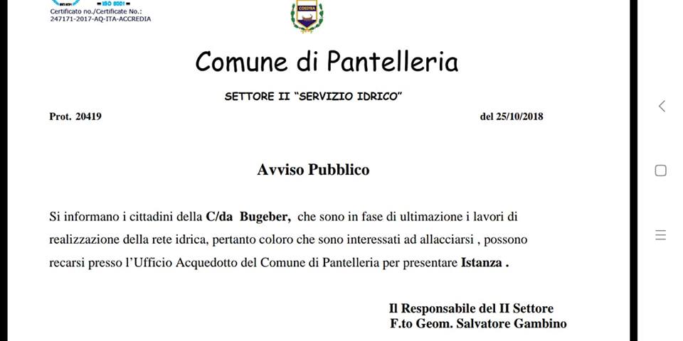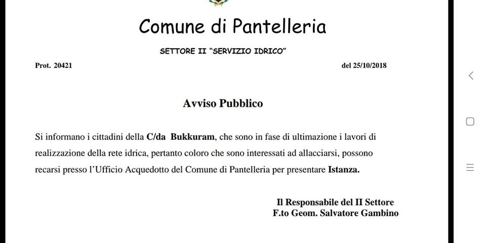 Sono in fase di ultimazione i lavori di realizzazione della rete idrica anche per le contrade di Bugeber e Bukkuram. L’amministrazione, per mezzo del Settore II “Servizio Idrico” ne fa annuncio in una nota, di sotto riportata, con avviso che gli utenti interessati sono invitati presso l’Ufficio Acquedotto del Comune di Pantelleria, per l’espletamento della relativa istanza.