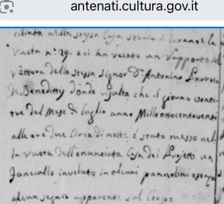 Secondo quanto riportato negli atti civili dal don Giuseppe Miano, Eletto di Polizia e Ufficiale dello Stato Civile, nella notte tra il 23 e il 24 luglio, alle ore due, la campanella posta accanto alla ruota dell’Annunziata, presso la Casa dei Proietti in una strada del borgo al n. 29, squillò nel silenzio della notte.